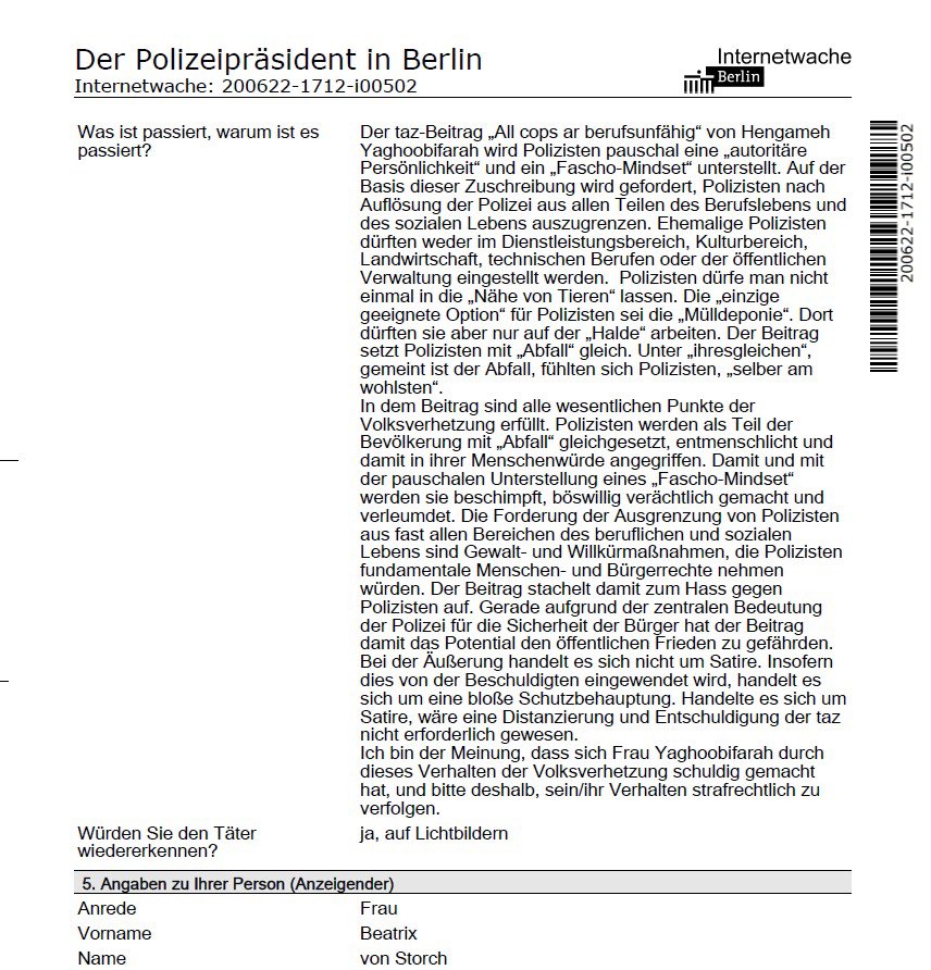 „Ich habe soeben Strafanzeige wegen Volksverhetzung gegen die taz-Autorin Hengameh Yaghoobifarah @habibitus gestellt.